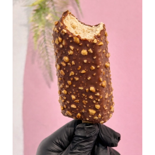 PICOLÉ DE COCO COM COBERTURA DE CHOCOLATE BRANCO, COCO E AMÊNDOAS.