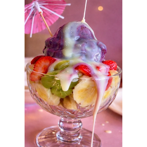 SALADA DE FRUTA, MORANGO, UVA, BANANA, LEITE CONDENSADO E AÇAÍ.